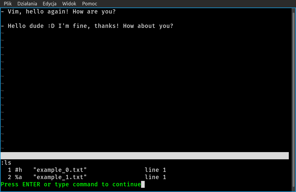 :edit example_0.txt<enter> – opens file example_0.txt (shortcut: :e):enew<enter> – to start with an empty, new file. In this example Vim is started opening the previous file - to illustrate the :enew command.i – to start typing, that is to say to switch to insert mode; right after starting Vim, if no files are passed as arguments, it is possible to simply press i and start typing contents of a new file, without points 0 and 1. Type the text: - Vim, hello again! How are you?<enter>